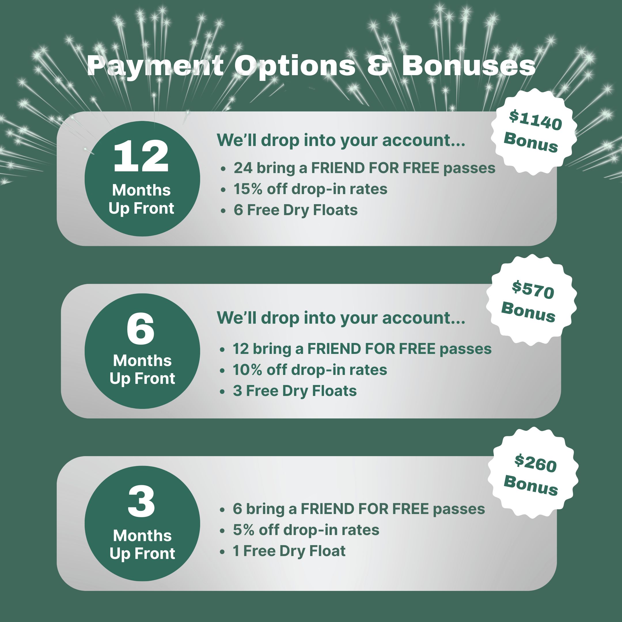One Float a month & any extra Float sessions can be purchased for the same price.